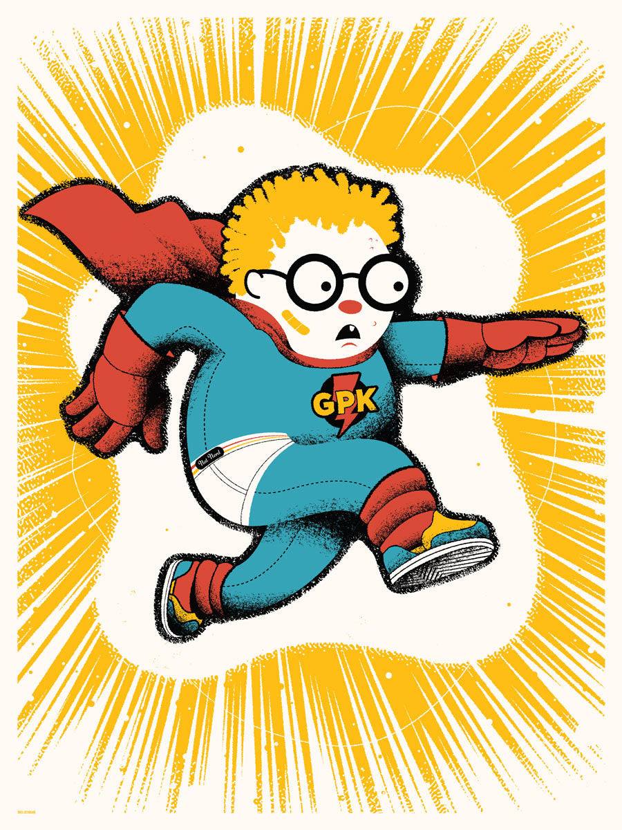 This print was our loving tribute to comic book nerds like ourselves. This was our official entry into the Gallery 1988, Garbage Pail Kids show. The original "Nat Nerd" was obviously gross but we tried to add a little love to our version.
