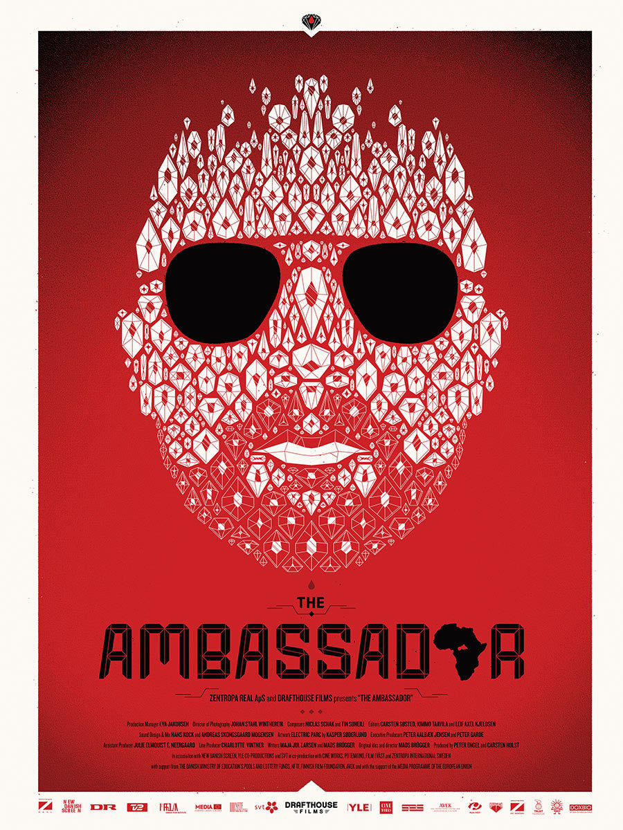 This is the official Mondo poster for the new documentary film "The Ambassador" which is a wild film about an undercover journalist who tries to buy his way into smuggling blood diamonds in the heart of Africa.